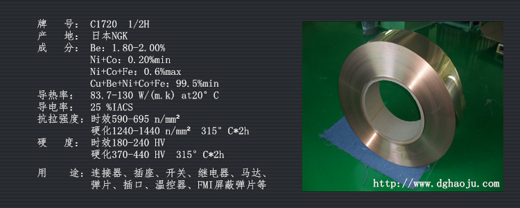 (較國產(chǎn)鈹銅的優(yōu)勢:含鈹量均勻,導(dǎo)電性能更佳,加工性更強不需要加工后熱處理;適用于高品質(zhì)連接器、開關(guān)、繼電器、等電子零部件方面。)